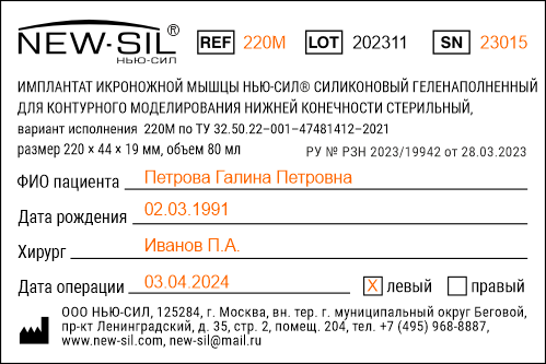 поздравляем, Вы используете имплантаты икроножной мышцы усовершенствованной конструкции НЬЮ-СИЛ®.